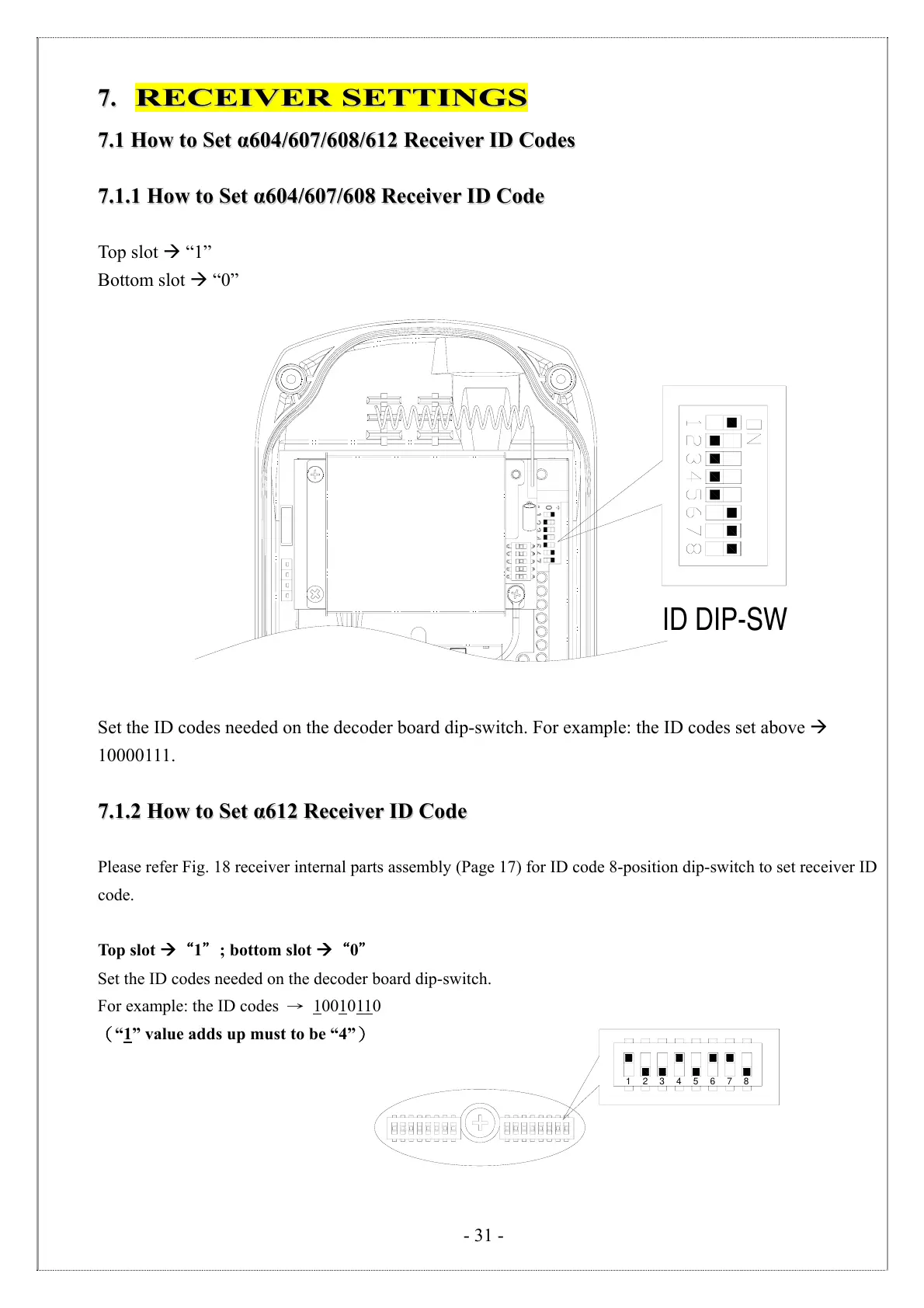 Please refer Fig. 18 receiver internal parts assembly (Page 17) for ID code 8-position dip-switch to set receiver ID