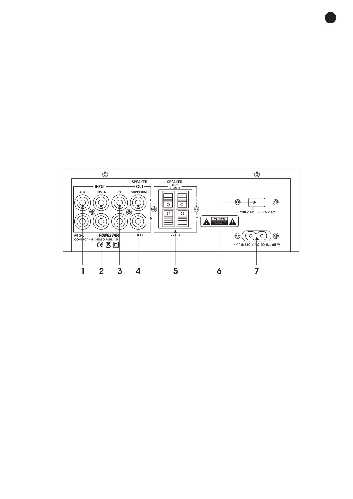 5.- SPEAKER OUT STEREO: stereo signal output for low impedance (4-8 Ω) loudspeakers, spring terminals.