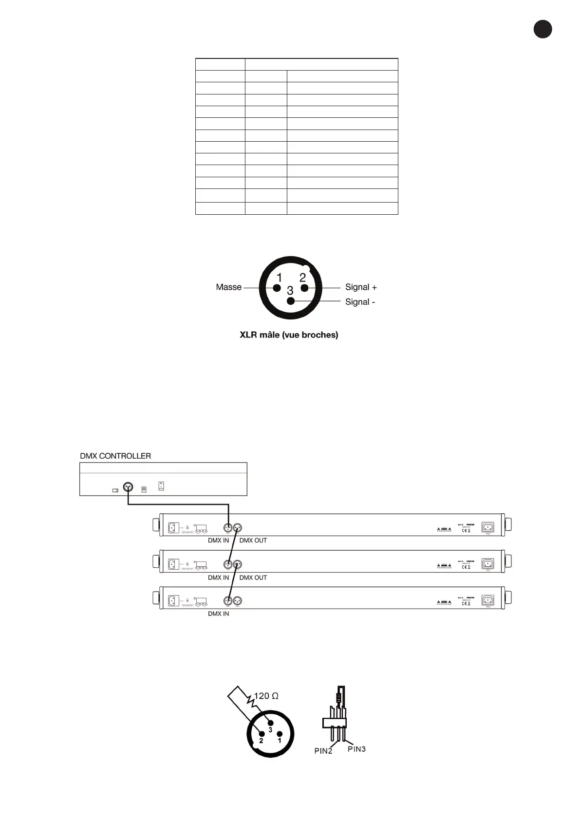 résistance de 120 Ω entre les terminaux 2 et 3 du connecteur XLR DMX OUT du dernier élément. Voir