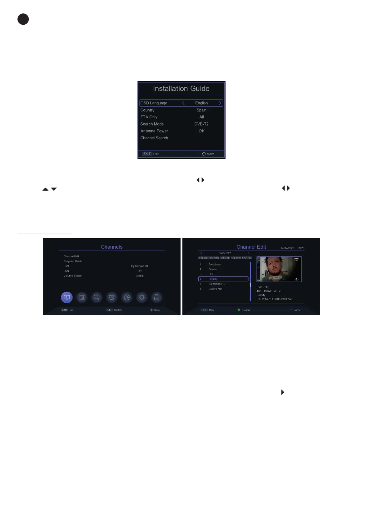- CHANNEL EDIT: allows different actions to be performed on the tuned channels: