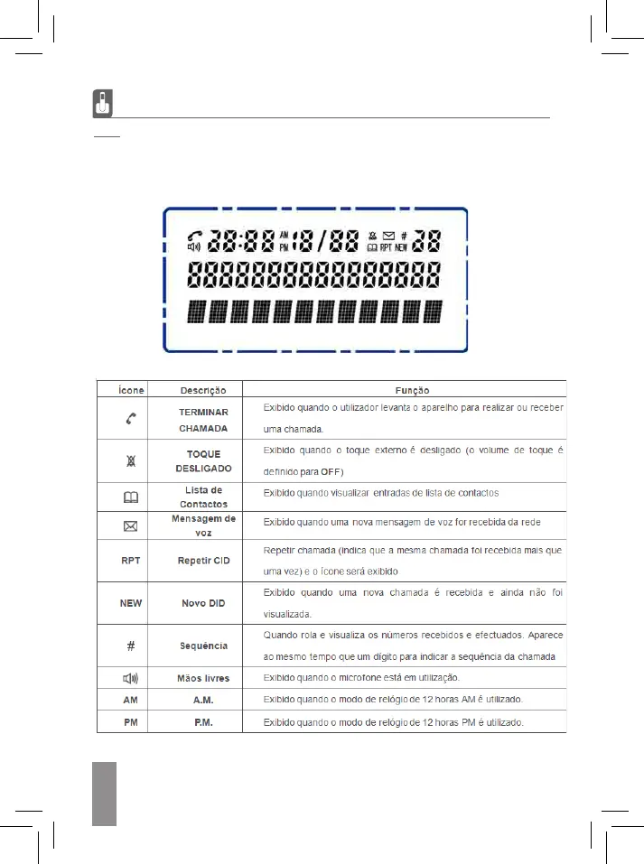 O LCD é exibido em 3 linhas: 1ª linha para ÍCONES, 2ª linha para 16 números com 7 segmentos,