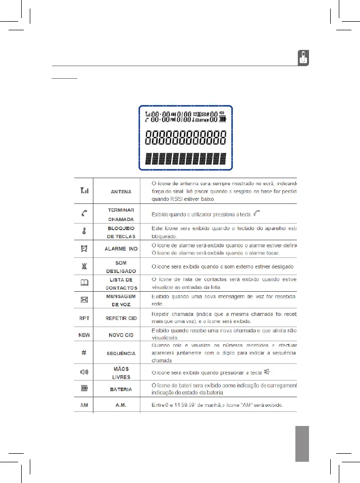 O LCD é exibido em 3 linhas: 1ª linha para ÍCONES, 2ª linha para 16 números com 7 segmentos,