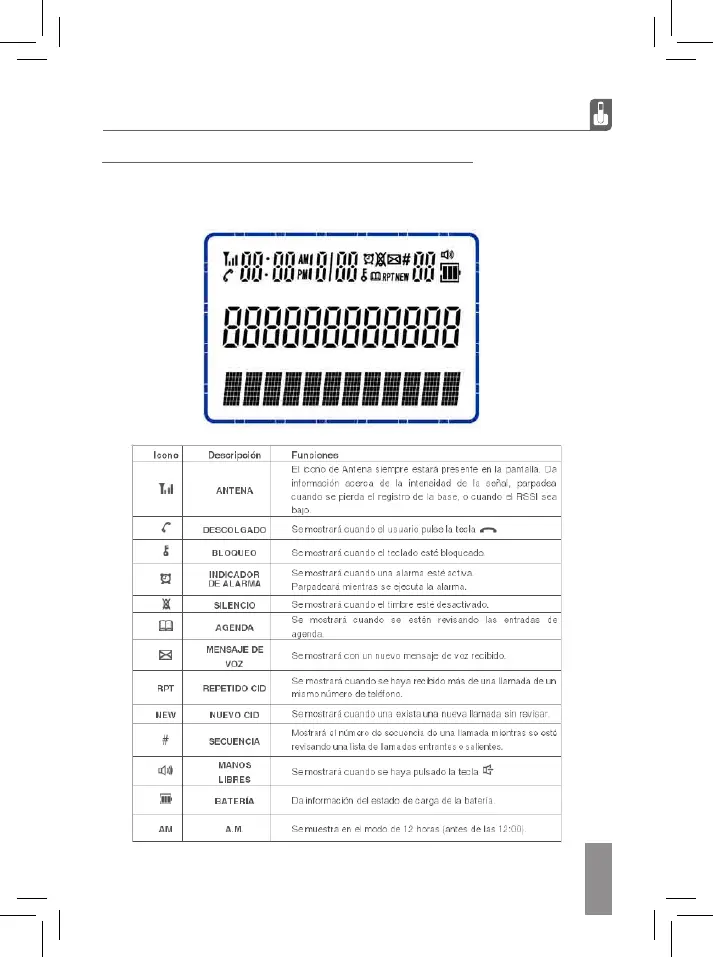 La pantalla está distribuida en 3 líneas: la primera contiene iconos, la segunda 16 caracteres de