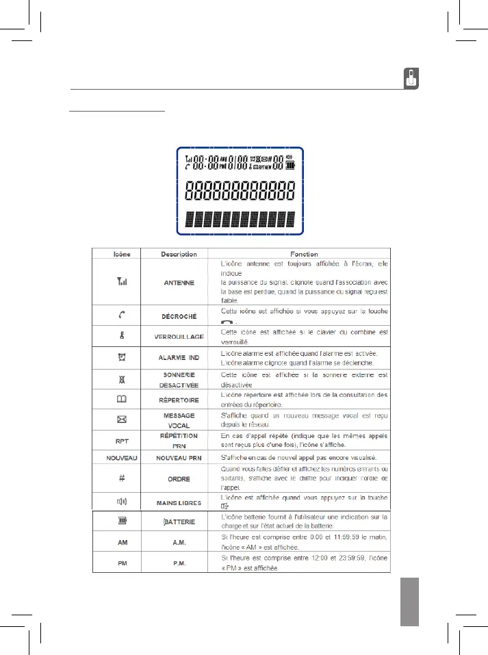 L’afchage LCD comprend 3 lignes, la première pour les ICÔNES, la deuxième de 12 chiffres en