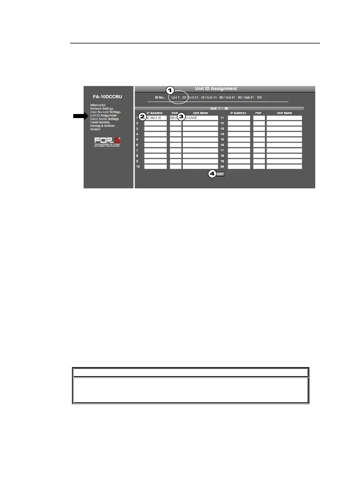 (2) Enter an IP address (required) under the Unit ID number for each unit (FA-505, FA-1010,