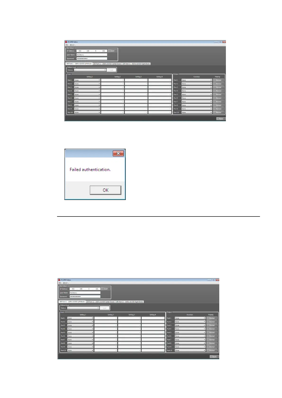 Use the FA-GPIO Editor to perform GPI assignments for GPI1 - 3 (Ports 1-30) connectors.