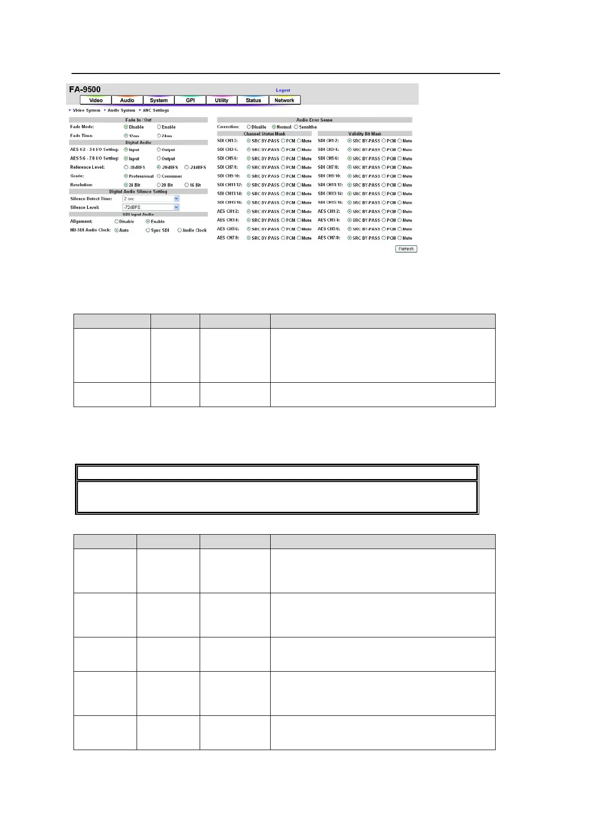 Ex.) If Fade Time is set to 12 ms, the audio delay must be longer than 14 msec; i.e. 12+