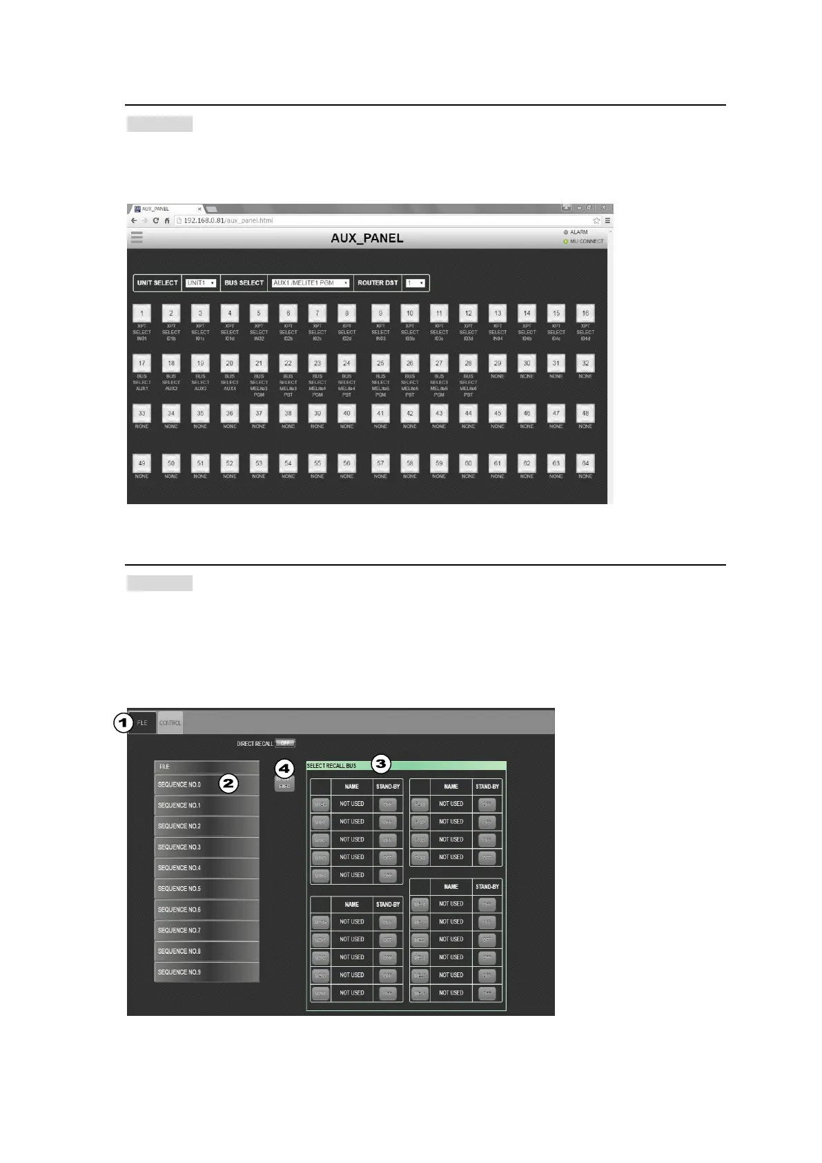 This page works as an AUX Box to control AUX buses on the switcher. To use these buttons,