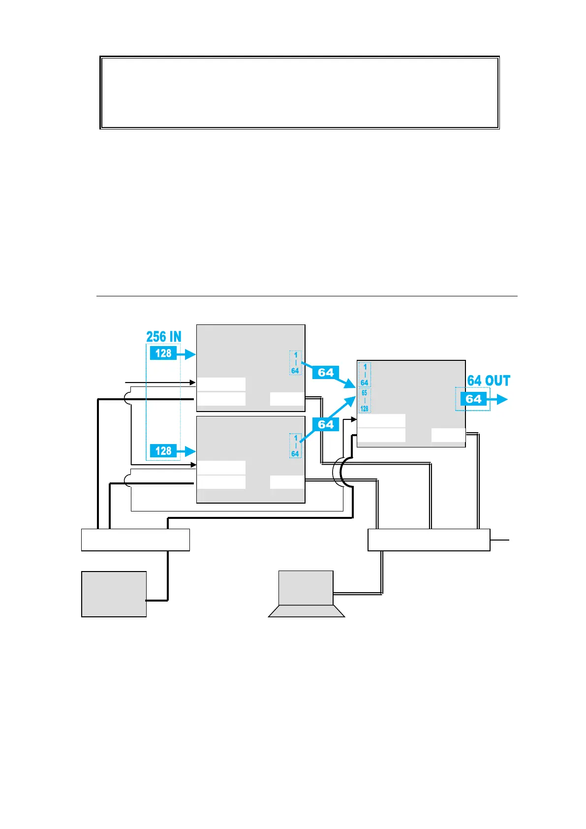 The system example below connects three MFR-5000 units to form a 256 x 64 virtual matrix.