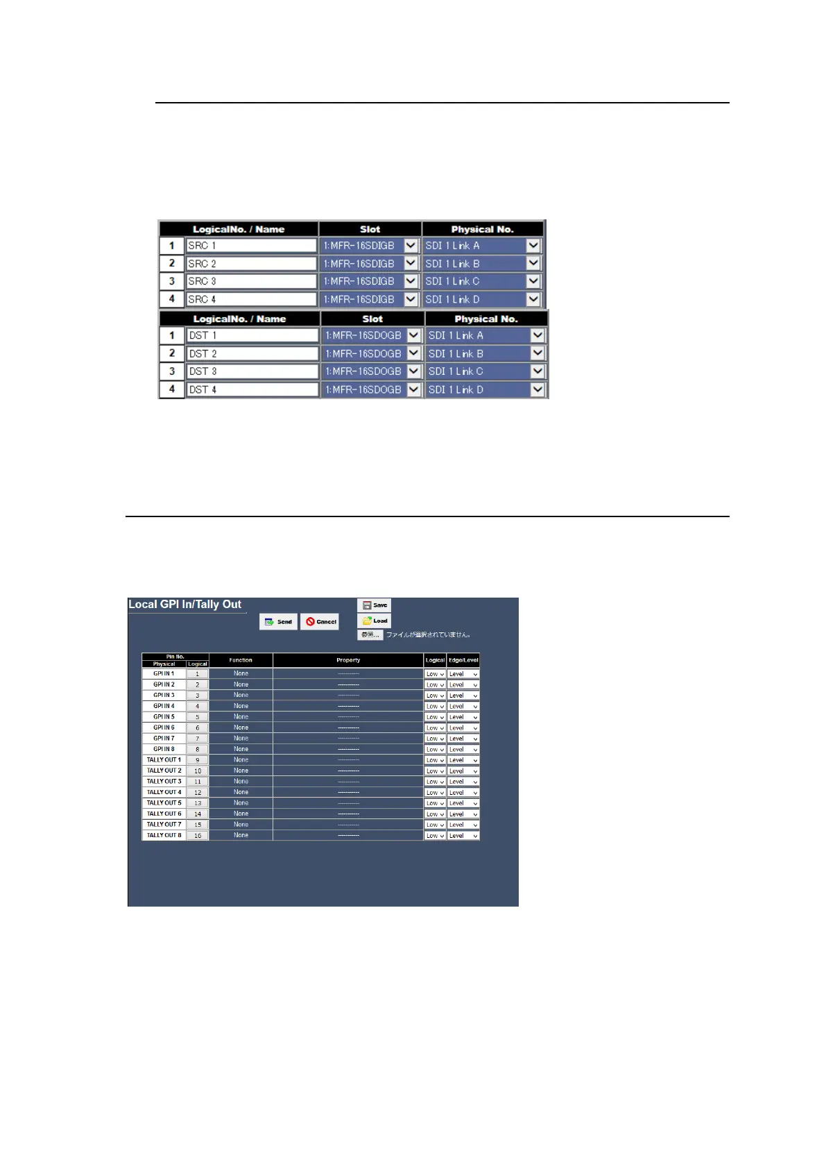 The Local GPI In/ Tally Out page allows you to assign functions to the MFR-1000 GPI In/ Tally Out