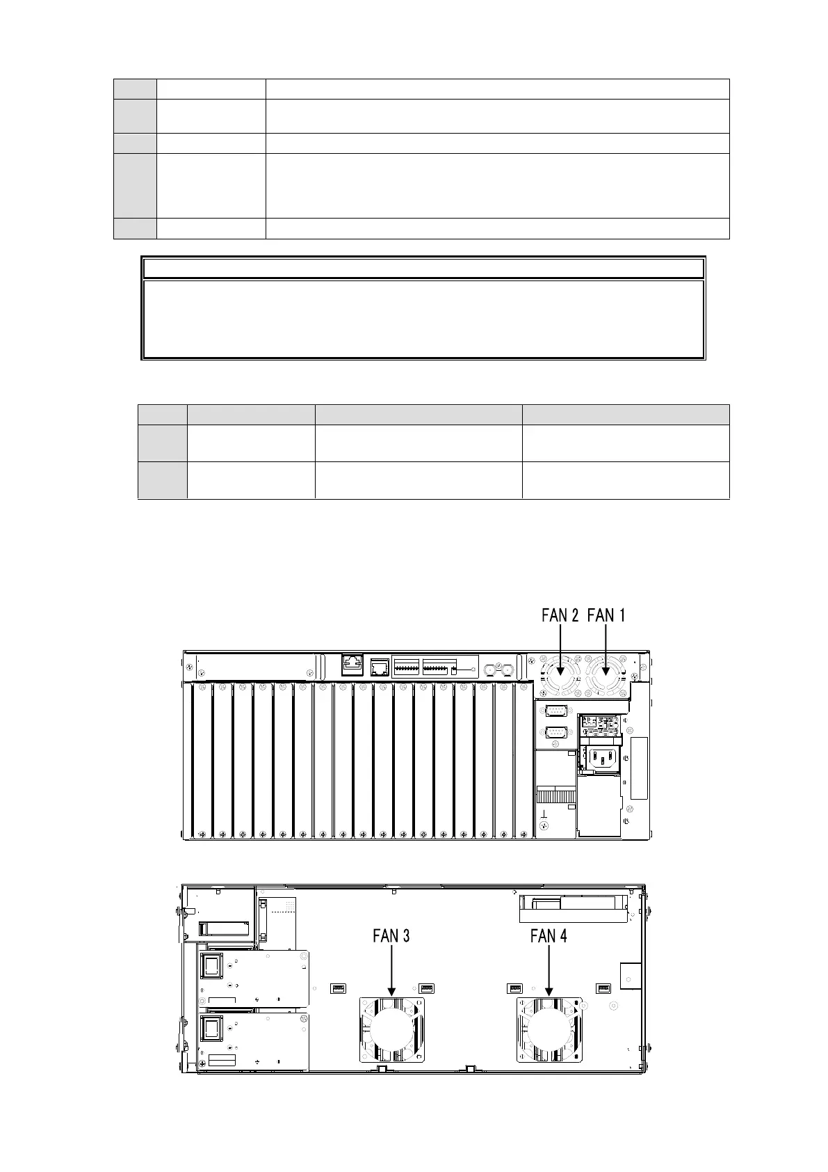 Four cooling fans are installed in MFR-3000 units: FAN 1 and 2 are on the rear panel and