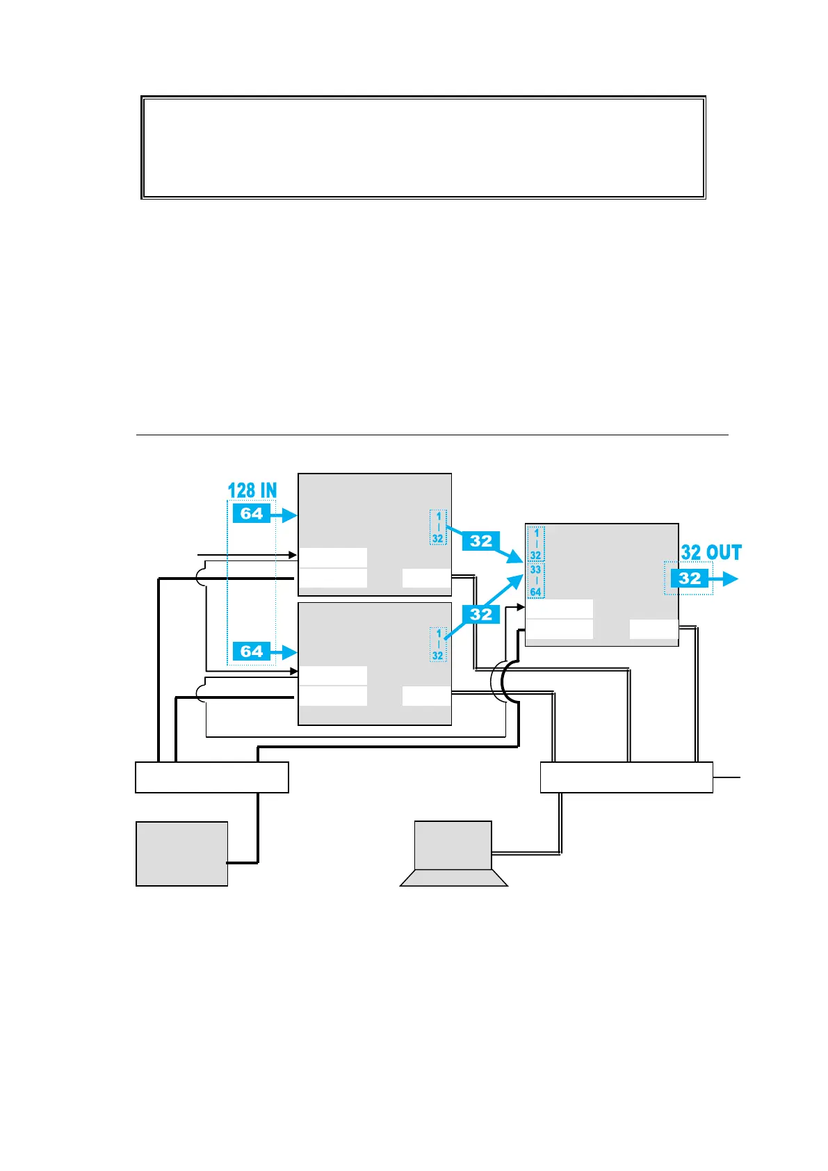 The system example below connects three MFR-3000 units to form a 128 x 32 virtual matrix.