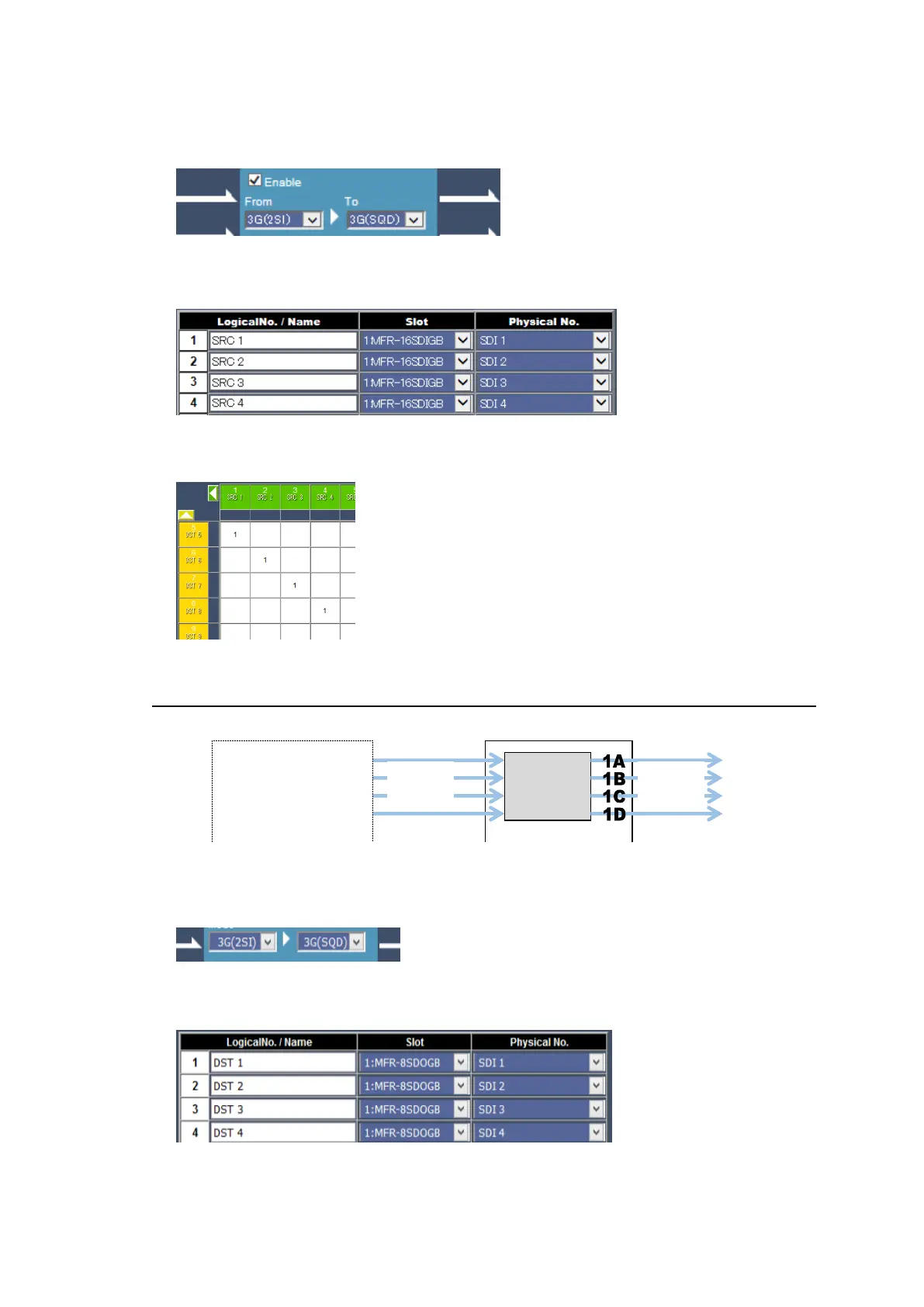 (SDI1-4) to logical channels (SRC 1-4).