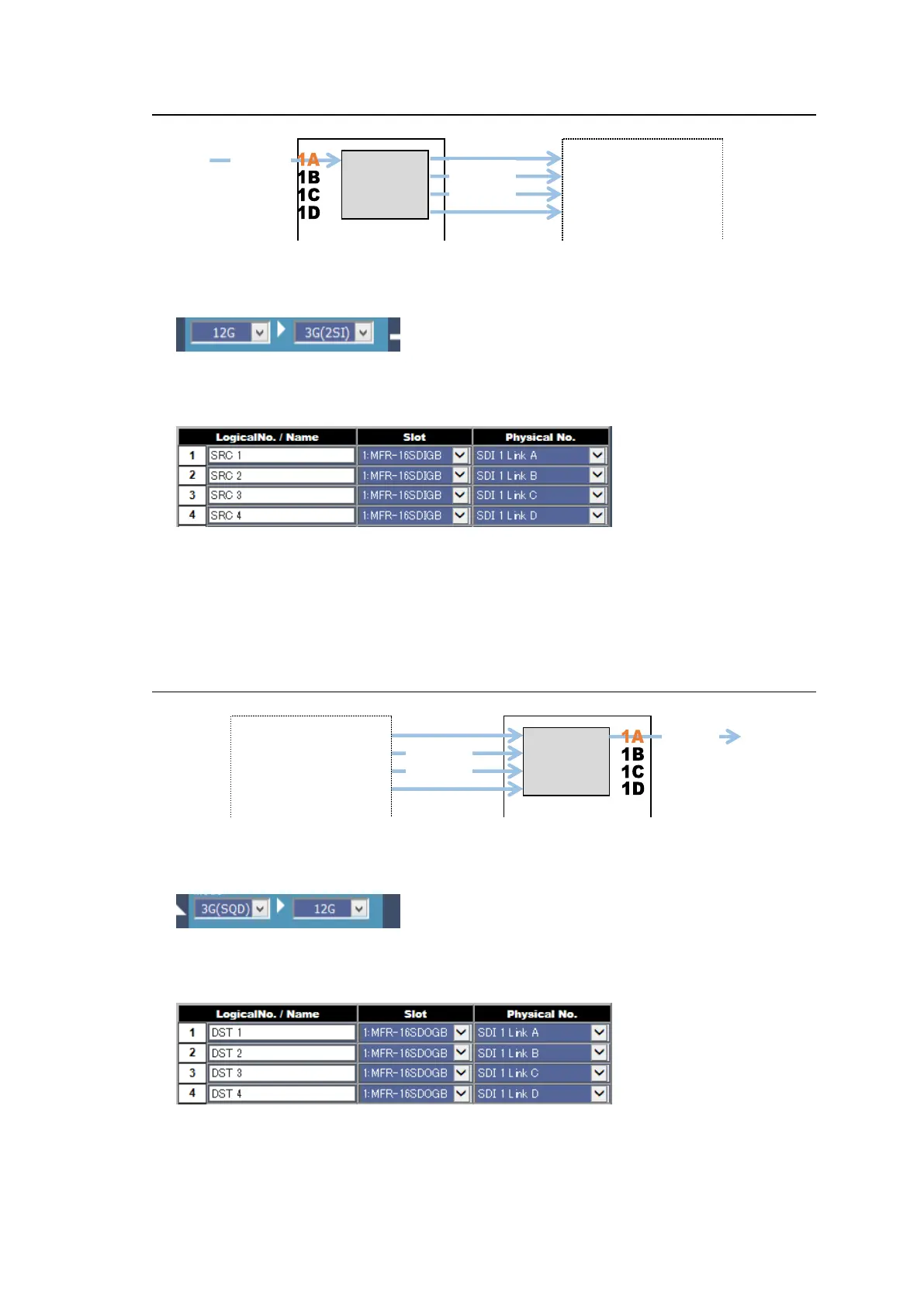 (SDI 1 Link A to D) to logical channels (SRC 1-4).