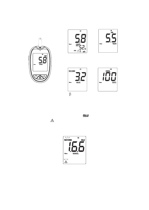 meter will display the blood glucose reading as well as a Ketone warning (