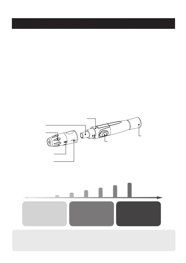 採血筆可重複使用,筆蓋上含有採血深度選擇裝置,共有6個採血深度可供選擇