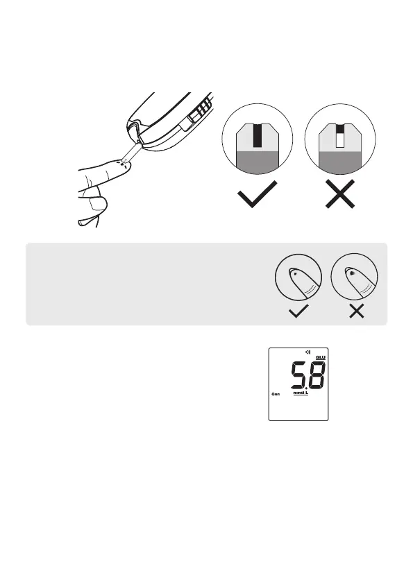 將試片吸入口以45度靠近手指上的血液,血液會被自動吸入,待反應區內吸滿血量