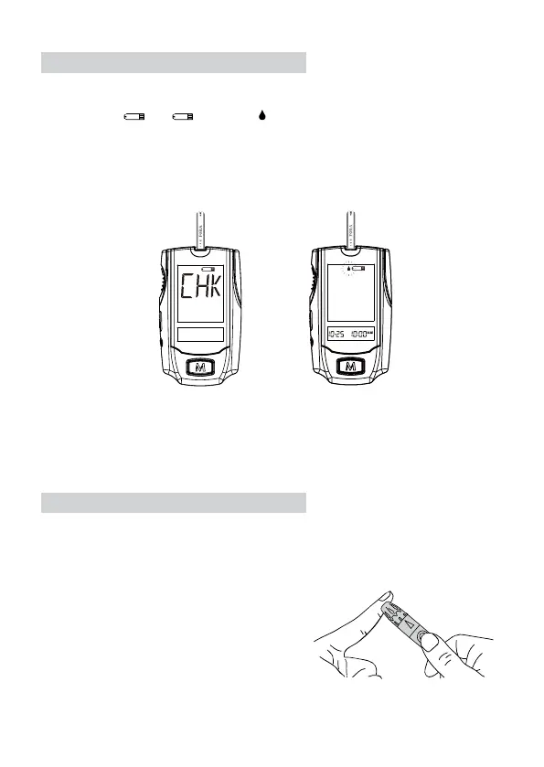 Insert a test strip by putting the contact bars end rst and facing up into the test