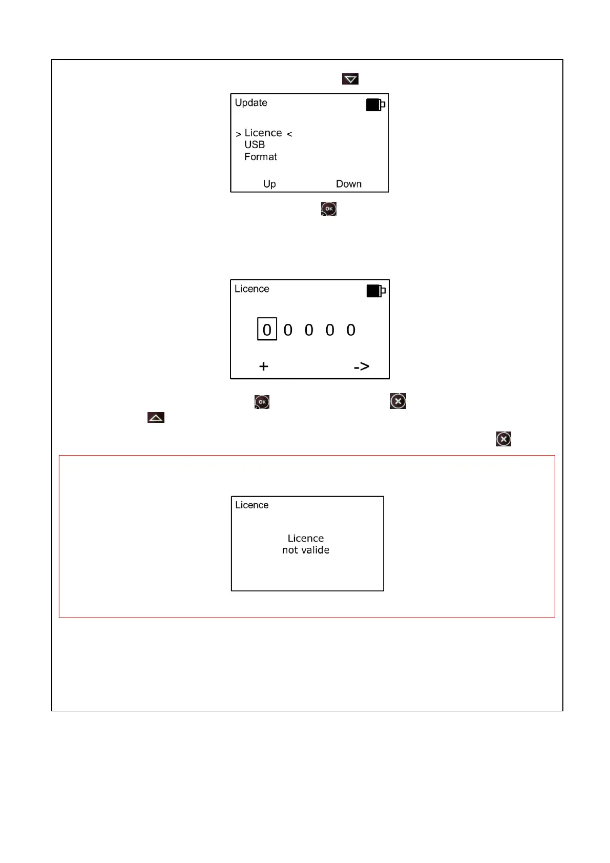 This screen allows entering the licence key. To change the number, press on the button “+” and to