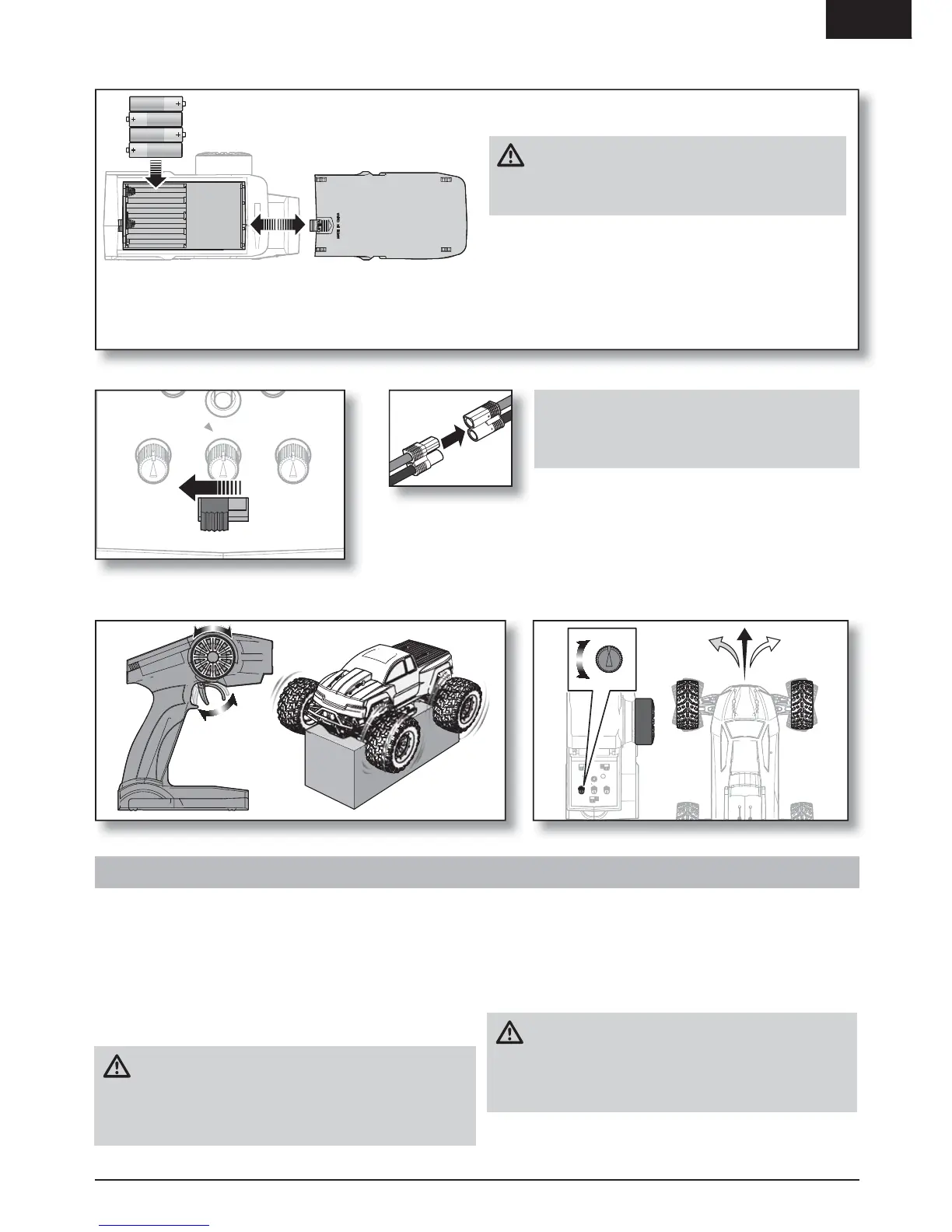 2. Power ON the transmitter. 3. Connect the vehicle battery, or batteries, to the ESC