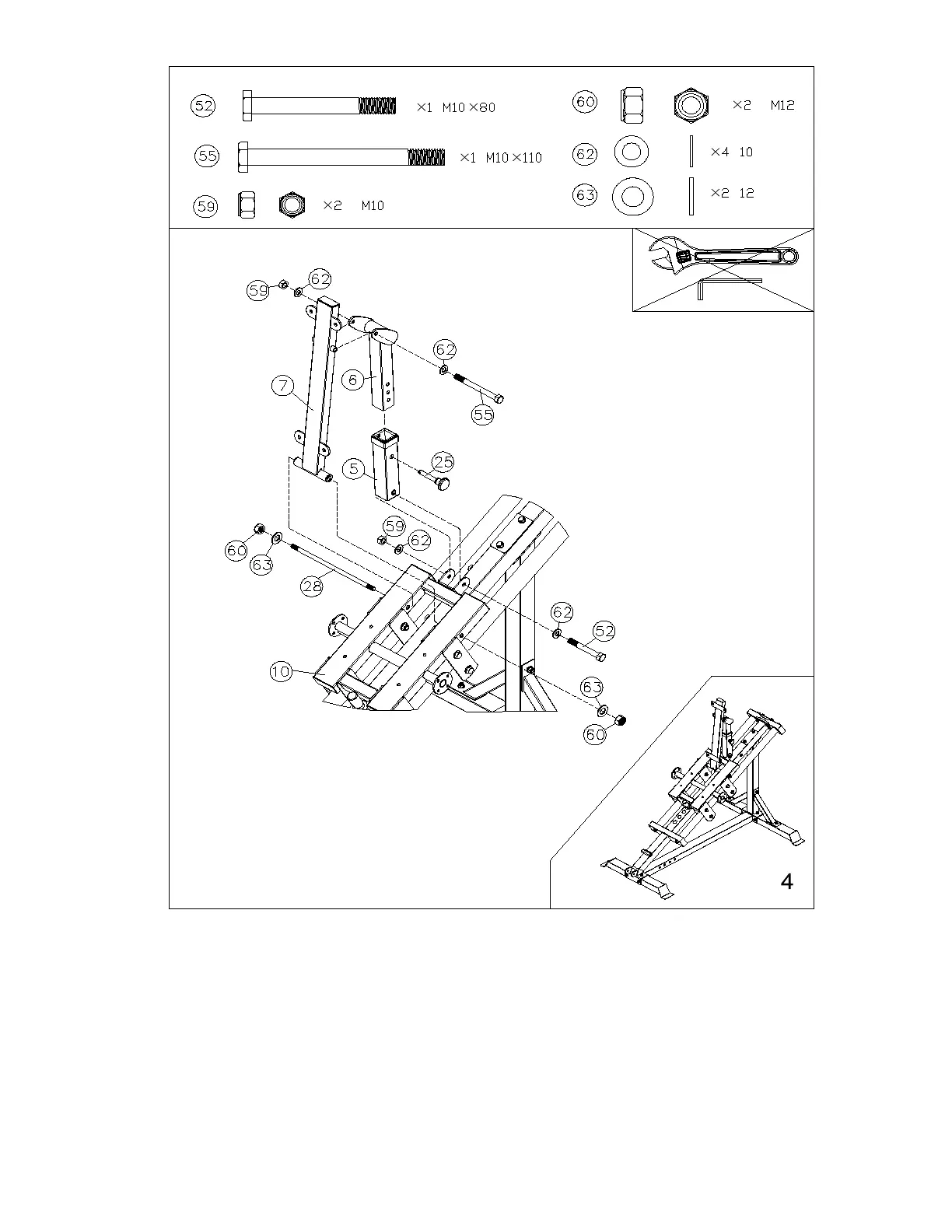 1. Attach Adjuster (5) to Sliding Frame (10) with M10x80 Bolt (52), Washers (62) and M10