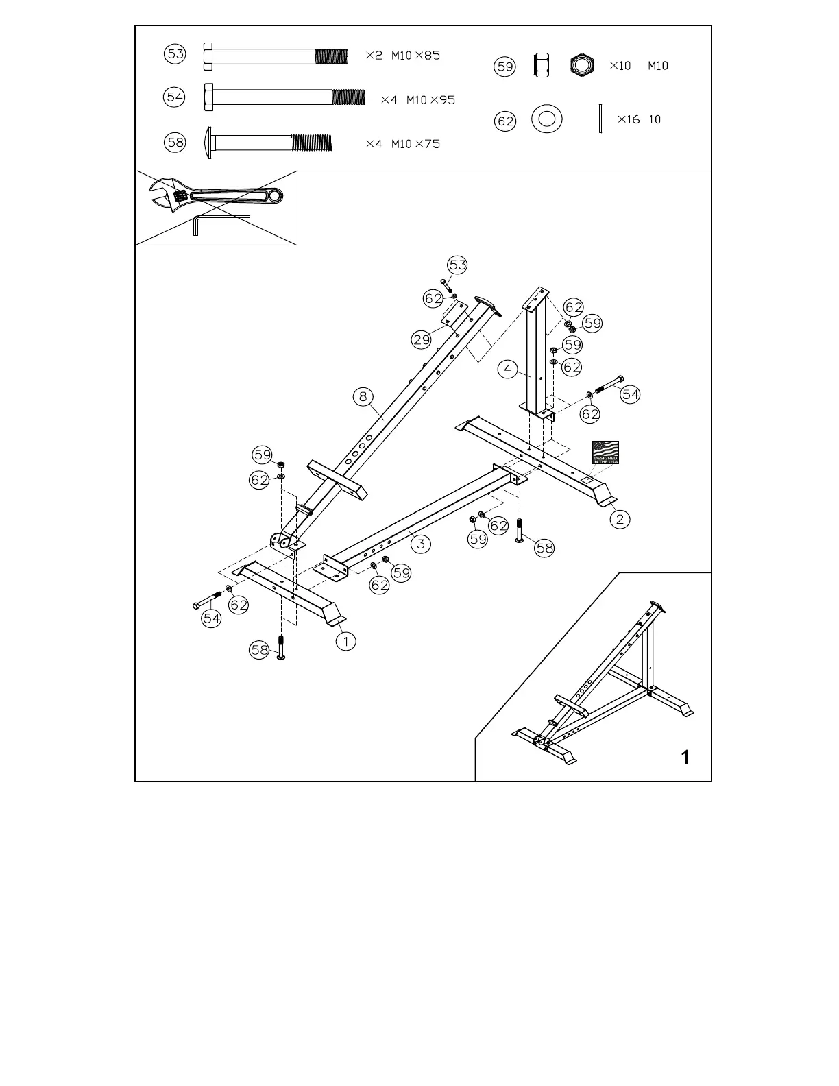 M10x75 Bolts (58) vertically and M10x95 Bolts (54) horizontally with Washers (62) and