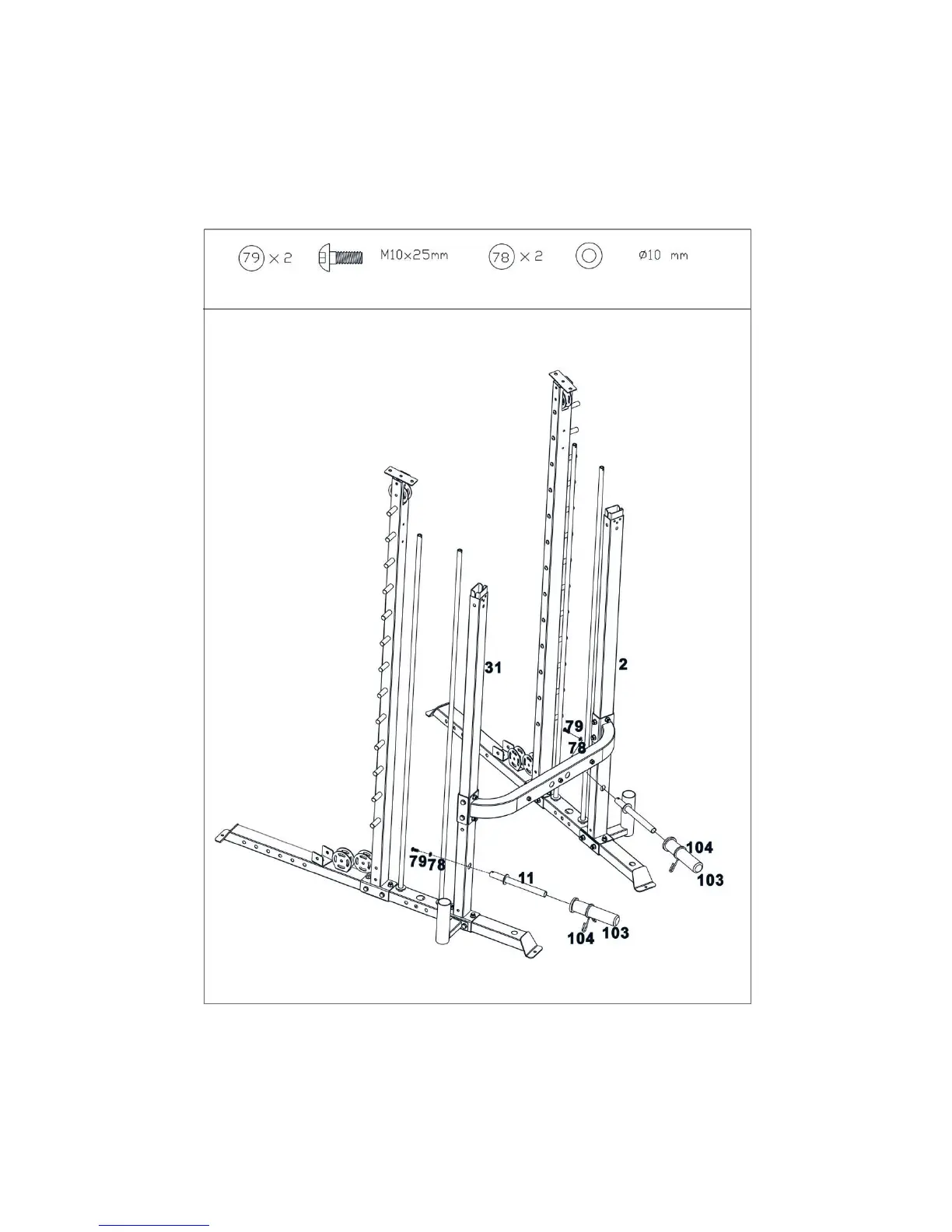 Attach the weight plate holder(11#) into the hole as the diagram shows and secure it with M10*25 Allen bolt(79#)