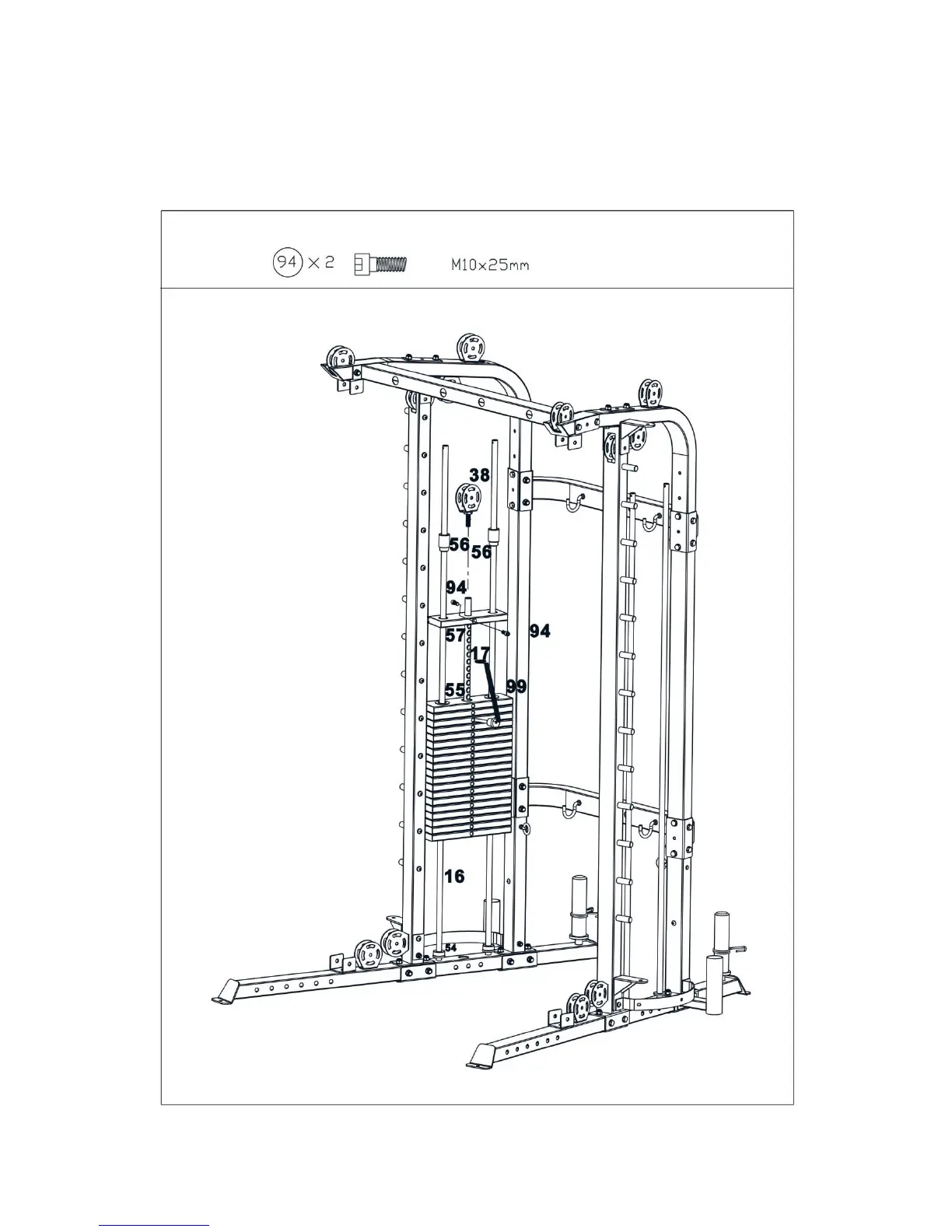 A. Place 2pcs rubber bumper(54#) along the guide rod and then place 19 pcs weight plate (55#) along the guide rod,