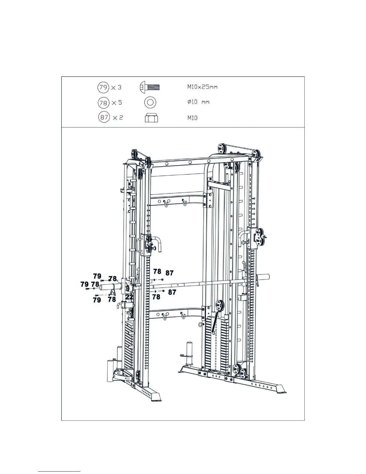 Attach the bearing frame (22#) with the barbell together and secure them with 3pcsM10×25 Allen bolt