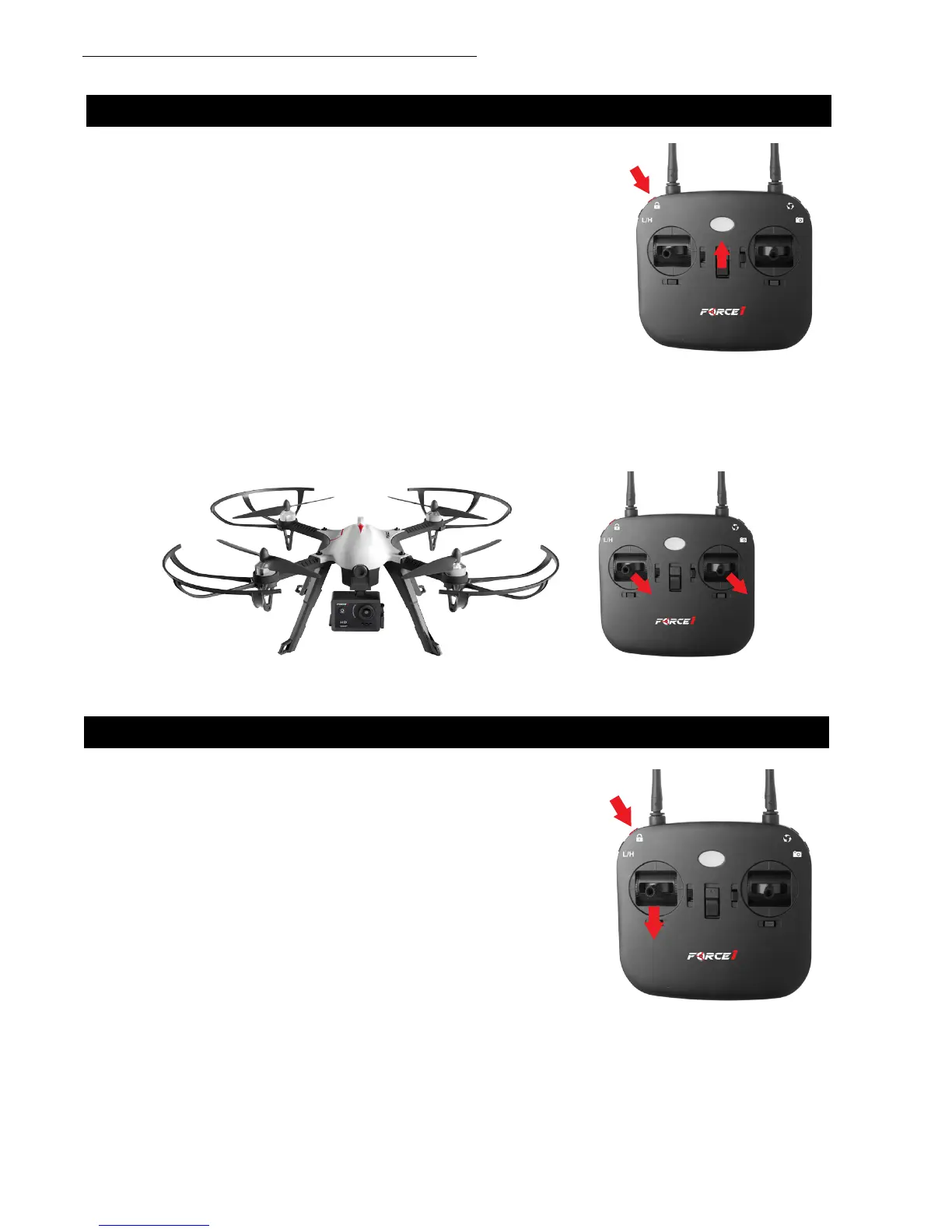 The left stick (throttle) must be pushed to the bottom position when pressing the red lock button.