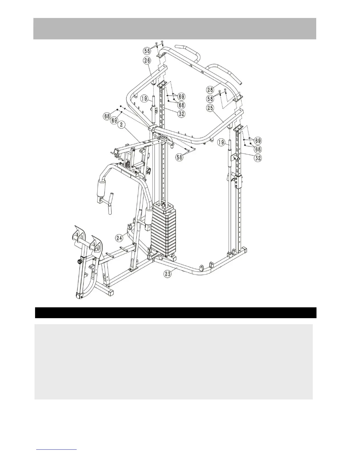 Place the chin up bar(28#) onto the left & right upper fame (25#,26#) and secure them with 4pcs
