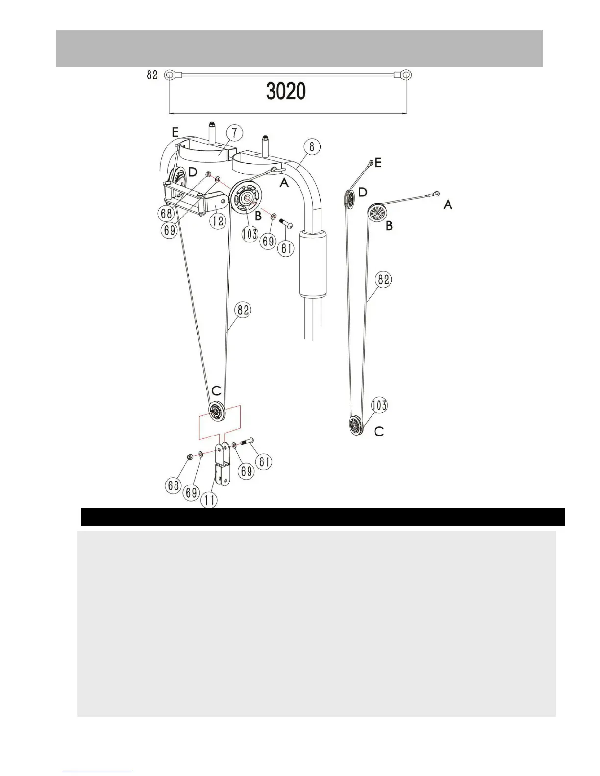 B. place 1X pulley (103#) below the cable , Secure the pulley to the swivel pulley bracket(12#) with