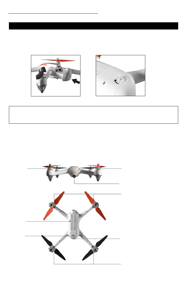 the tab and remove the battery. NOTE: Battery removal is the ONLY WAY to power off the drone.