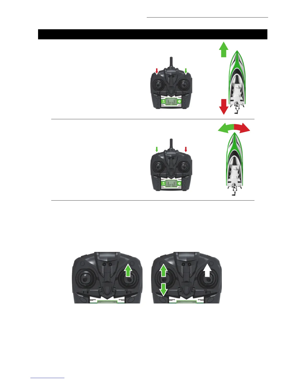 2. Keep the DIRECTION STICK up and push up and down the THROTTLE STICK until the boat is right-