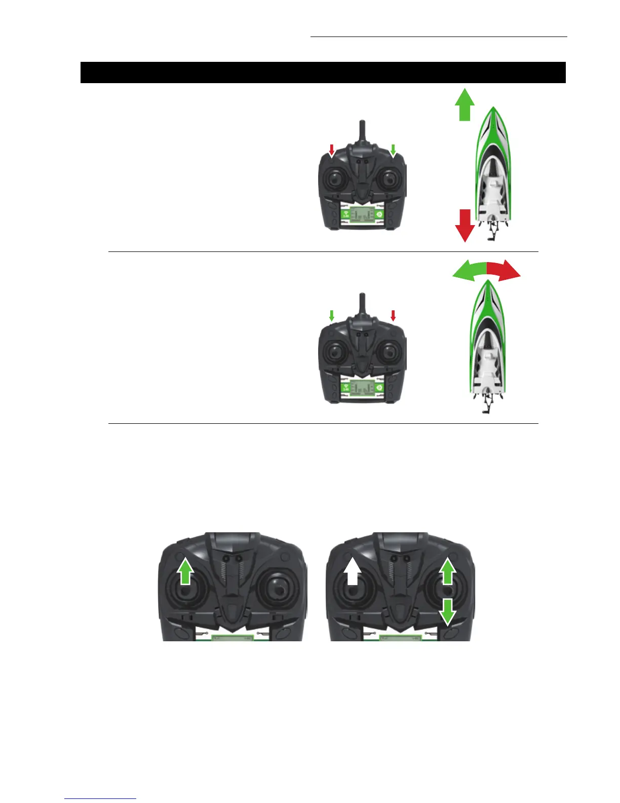 2. Keep the DIRECTION STICK up and push up and down the THROTTLE STICK until the boat is right-