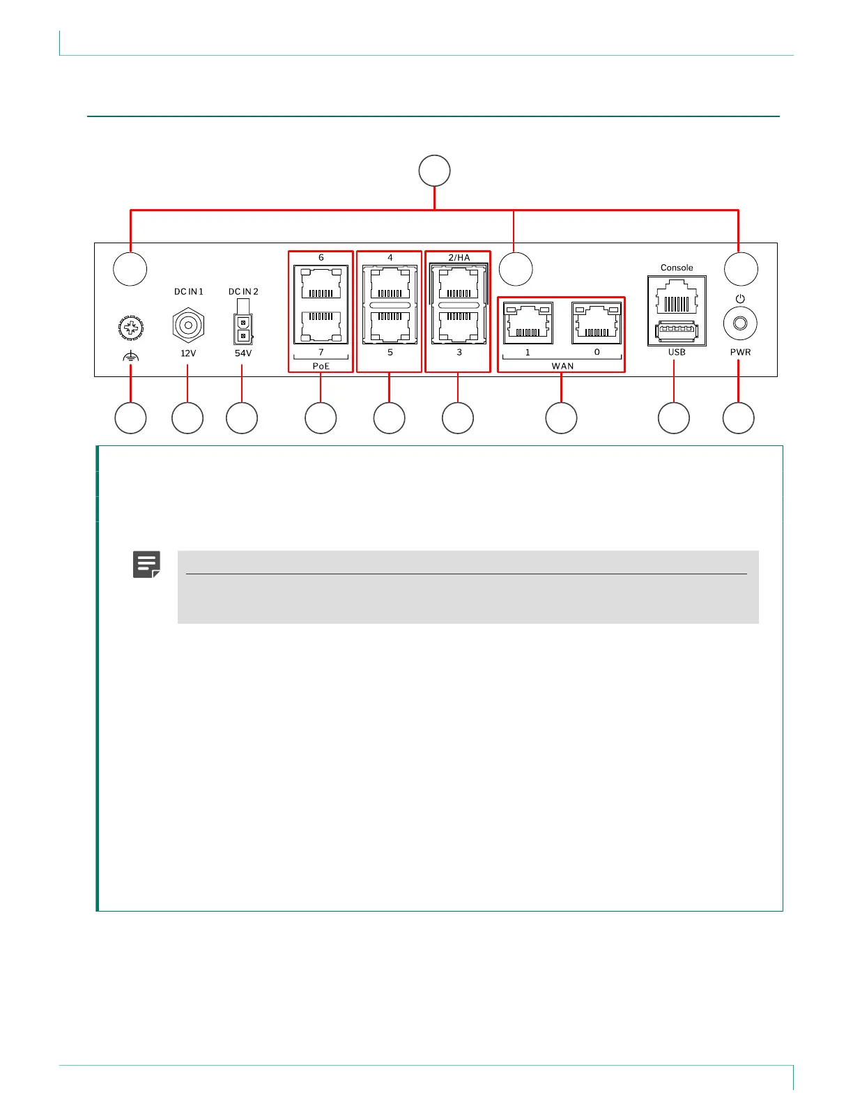 4 Power connector DC IN 2 — Optionally provides 54V DC power for the power over Ethernet (PoE) ports.