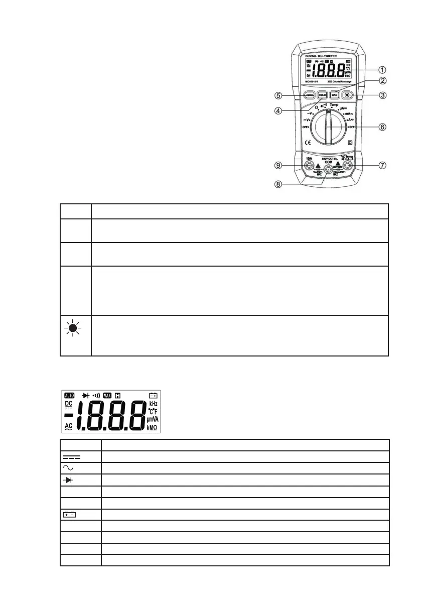 tipkom prebacujete se između DC/AC napona, Dioda/protok i °C / °F.