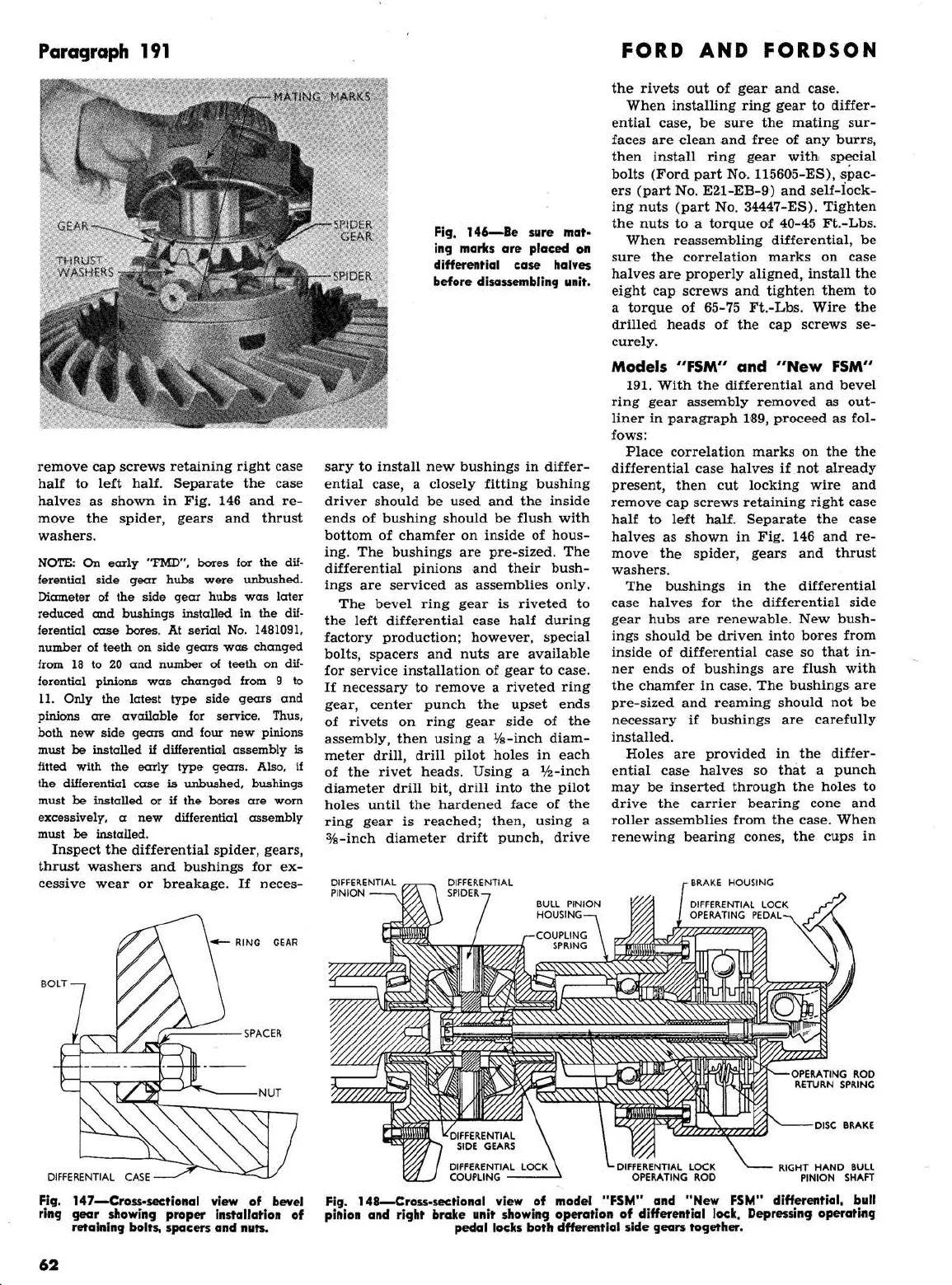 Ford 2000 super dexta - FMD, FPM, FSM, New FSM: Cross-Sectional View of Bevel Ring Gear; Cross-Sectional View of Model FSM and New FSM Differential, Bull Pinion and Right Brake Unit