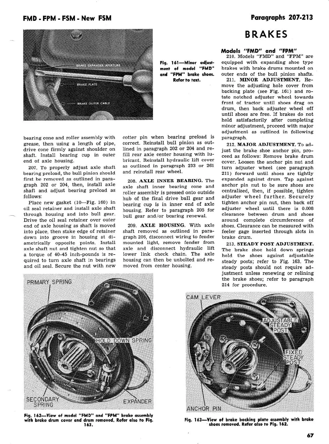 Ford 2000 super dexta - FMD, FPM, FSM, New FSM: Brakes; View of Model FMD and FPM Brake Assembly with Brake Drum Cover and Drum Removed; View of Brake Backing Plate Assembly with Brake Shoes Removed; Minor Adjustment of Model FMD and FPM Brake Shoes Illustration