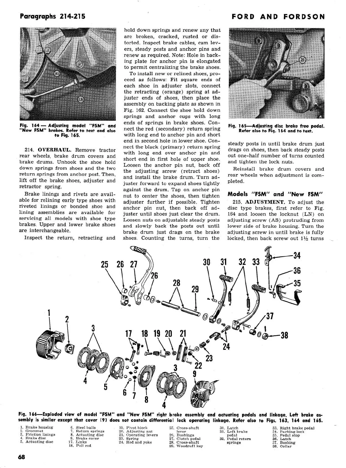 Ford 2000 super dexta - Exploded View of Model FSM and New FSM Right Brake Assembly and Actuating Pedals and Linkage; Adjusting Model FSM and New FSM Brakes Illustration; FMD, FPM, FSM, New FSM: Adjusting Disc Brake Free Pedal Illustration