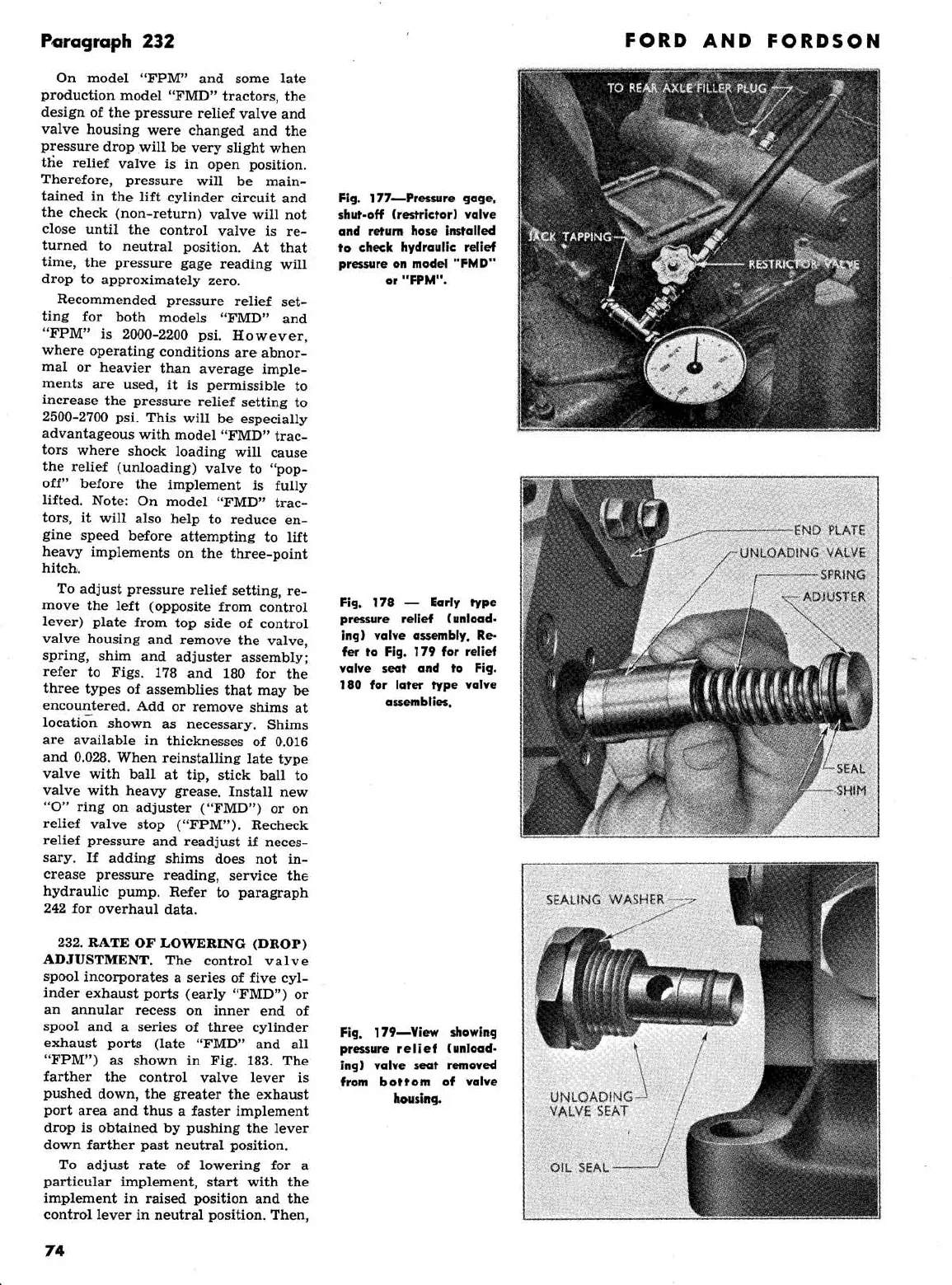 Ford 2000 super dexta - Pressure Gage Shut off Valve and Return Hose Installed to Check Hydraulic Relief Pressure on Models FMD and FPM; Early Type Pressure Relief Valve Assembly Illustration; View Showing Pressure Relief Valve Seat Removed from Bottom of Valve Housing