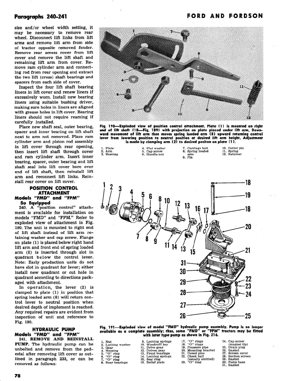 Ford 2000 super dexta - Models FMD and FPM: Position Control Attachment; Models FMD and FPM: Hydraulic Pump; Model FMD Hydraulic Pump Assembly Exploded View