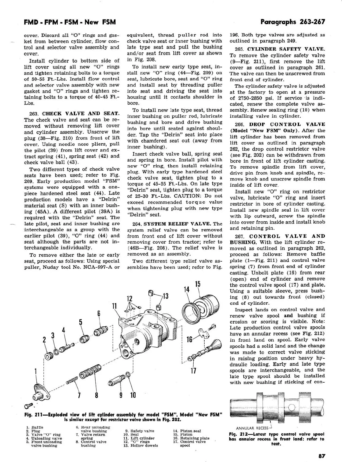 Ford 2000 super dexta - Exploded View of Lift Cylinder Assembly for Model FSM; FSM and New FSM: Check Valve and Seat;System Relief Valve; FSM and New FSM: Cylinder Safety Valve;Drop Control Valve; FSM and New FSM: Control Valve and Bushing