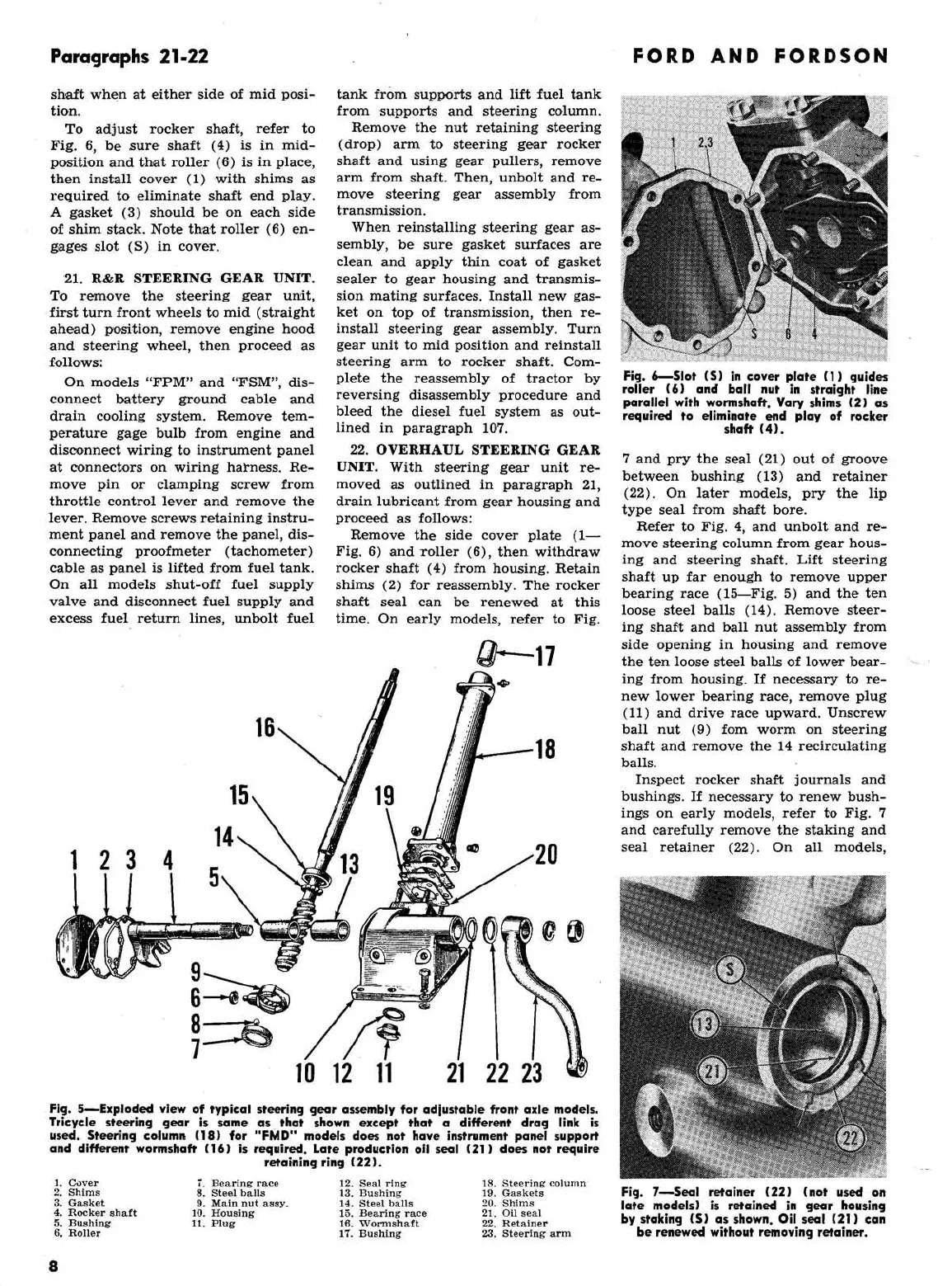 Ford 2000 super dexta - FMD, FPM, FSM, New FSM: Exploded View of Typical Steering Gear Assembly for Adjustable Front Axle Models; FMD, FPM, FSM, New FSM: Seal Retainer View