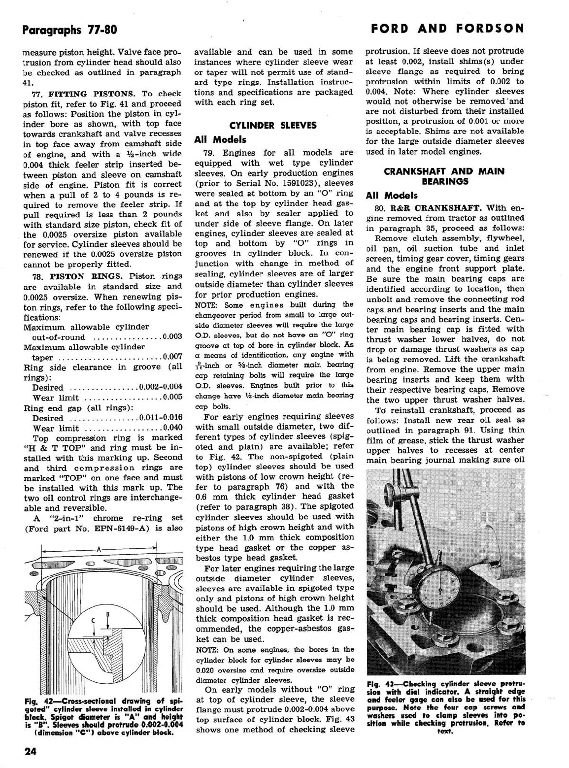 Ford 2000 super dexta - FMD, FPM, FSM, New FSM: Cylinder Sleeves; FMD, FPM, FSM, New FSM: Crankshaft and Main Bearings; FMD, FPM, FSM, New FSM: Cross-Sectional Drawing of Spigoted Cylinder Sleeve Installed in Cylinder Block; FMD, FPM, FSM, New FSM: Checking Cylinder Sleeve Protruson with Dial Indicator