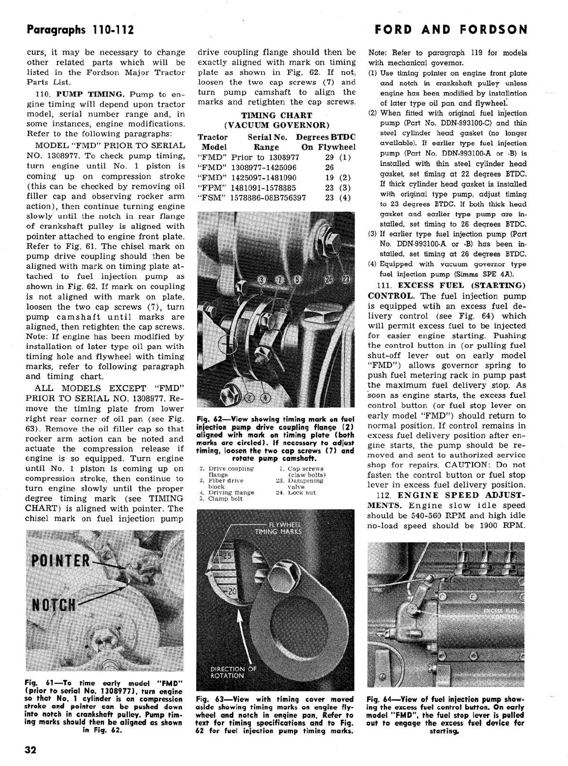 Ford 2000 super dexta - FMD, FPM, FSM, New FSM: Timing Chart (Vacuum Governor); FMD, FPM, FSM, New FSM: View Showing Timing Mark on Fuel Injection Pump Drive Coupling Flange; FMD, FPM, FSM, New FSM: View of Fuel Injection Pump Showing the Excess Fuel Control Button