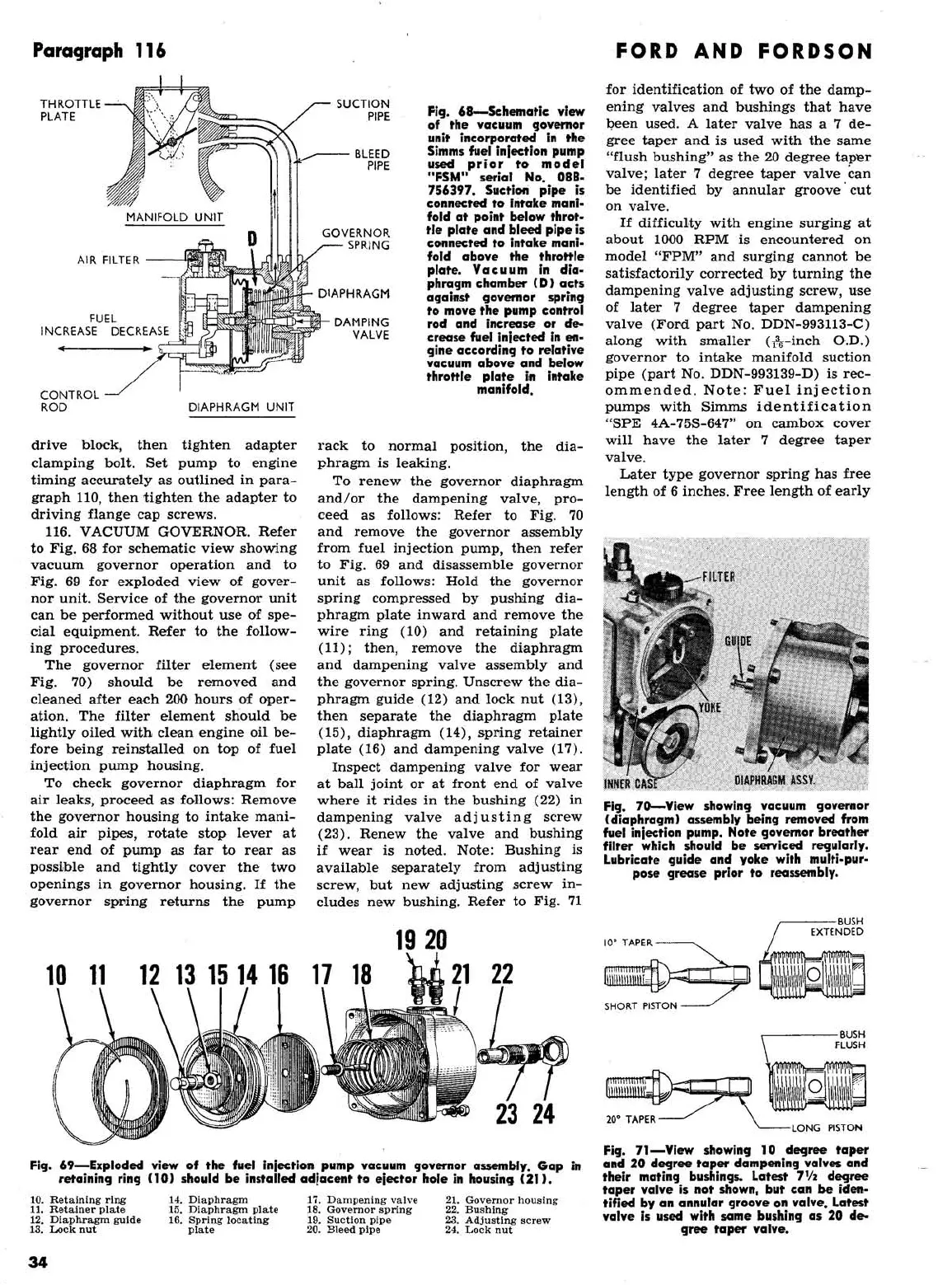 Ford 2000 super dexta - FMD, FPM, FSM, New FSM: Schematic View of the Vacuum Governor Unit Incorporated in the Simms Fuel Injection Pump; FMD, FPM, FSM, New FSM: Exploded View of the Fuel Injection Pump Vacuum Governor Assembly; FMD, FPM, FSM, New FSM: View Showing Vacuum Governor Assembly Being Removed from Fuel Injection Pump; FMD, FPM, FSM, New FSM: View Showing 10 Degree Taper and 20 Degree Taper Dampening Valves and Their Mating Bushings