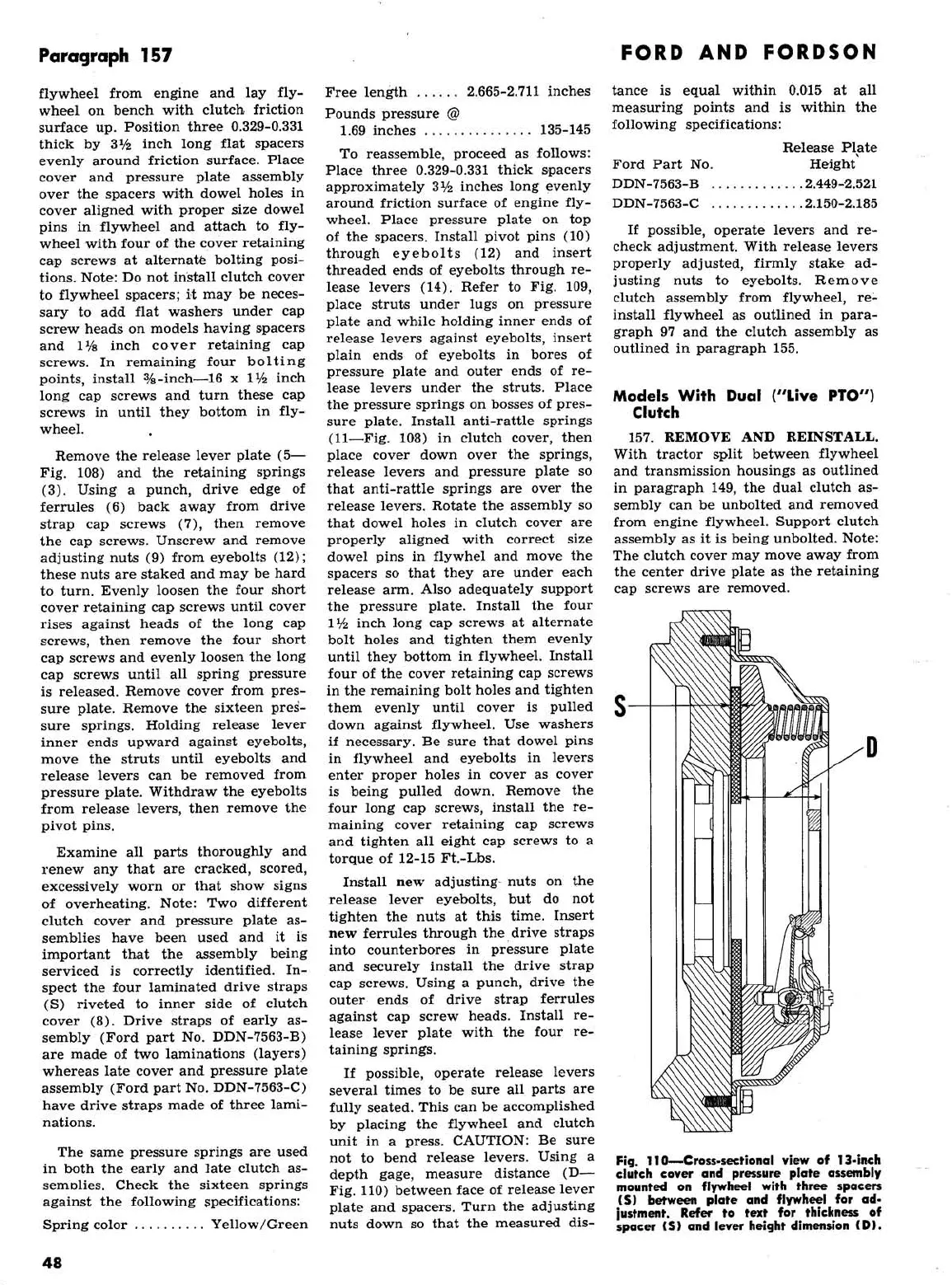 Ford 2000 super dexta - Models with Dual (Live PTO) Clutch; FMD, FPM, FSM, New FSM: Cross-Sectional View of 13-Inch Clutch Cover and Pressure Plate Assembly Mounted on Flywheel with Three Spacers
