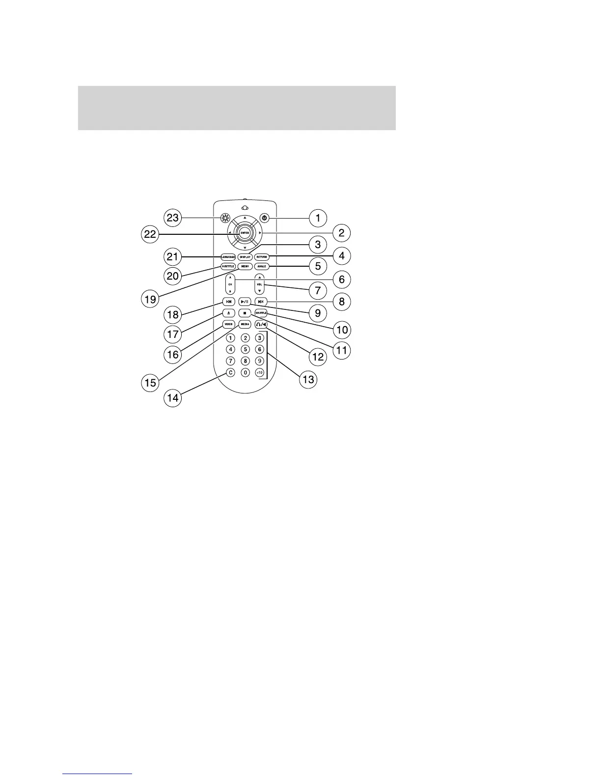 5. ANGLE (DVD dependent): Press to select the angle to view the