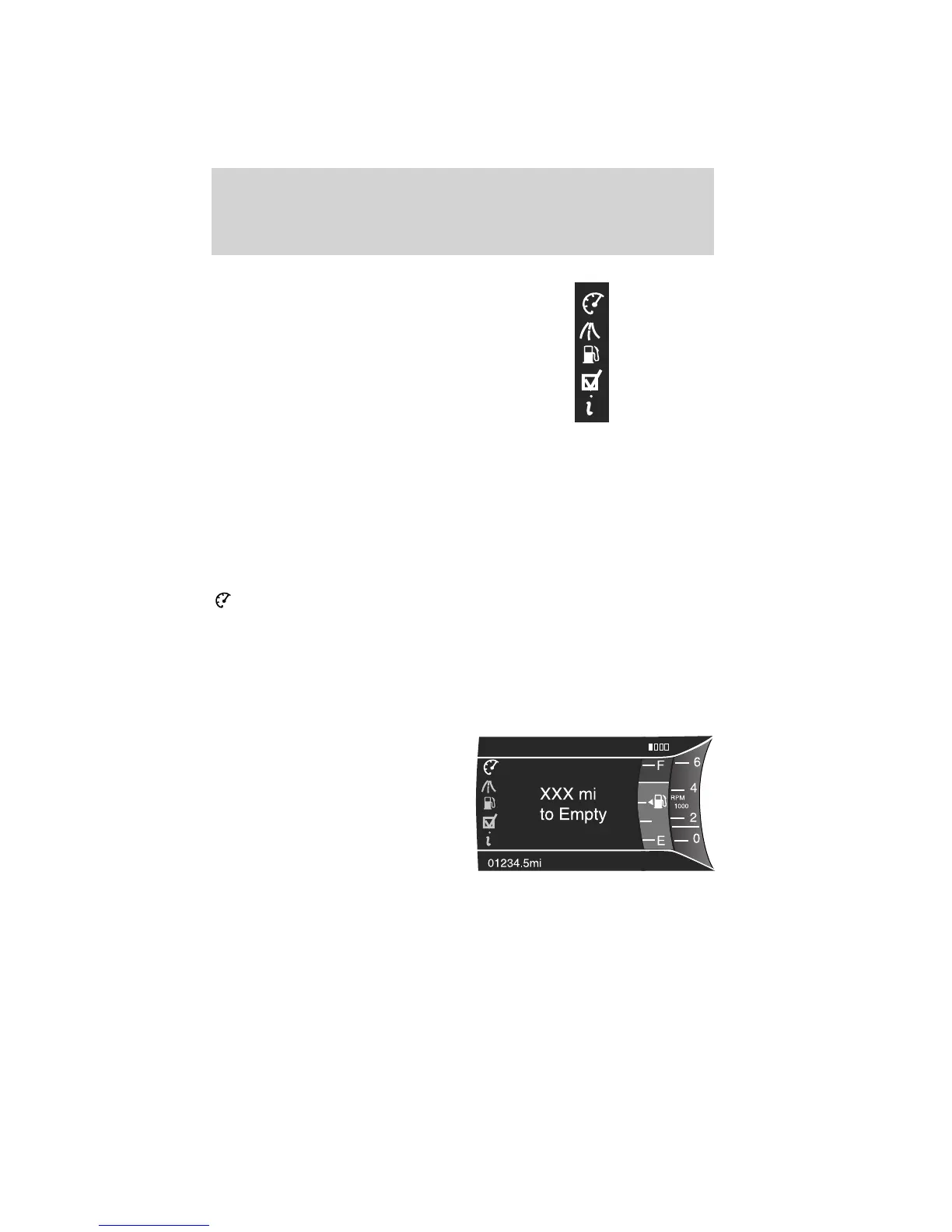 • Distance to empty (DTE): Shows approximate fuel level before the